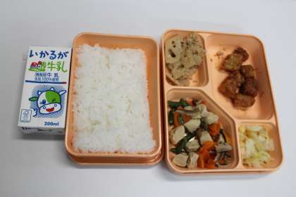 今日の給食メニューは、鮪のオーロラ煮・高野どうふの含め煮・れんこんのそぼろ炒め・キャベツの酢のもの・米飯・牛乳の6品です。