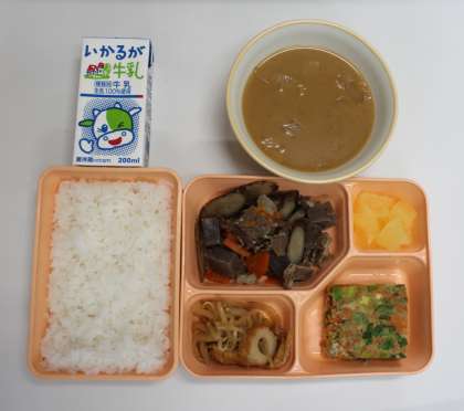 10月5日(近) 給食の献立は、牛肉とごぼうの炒め煮、千草焼き、ちくわともやしの炒めもの、りんご缶詰、みそ汁、米飯、牛乳でした。