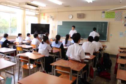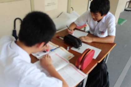 友だちを待っている2人は廊下に机を出して音楽流しながら勉強しています。