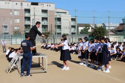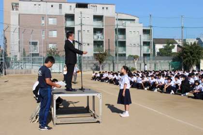 また、女子ソフトテニス部が大阪市中学校秋季総合体育大会8ブロック予選大会団体の部で2位、ペアの部で5位、大阪市中学校秋季総合体育大会8ブロック大会団体の部で3位になり、校長先生から代表生徒に表彰状が授与され、全校生徒から大きな拍手で祝福されました。おめでとうございます!