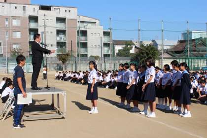 10月9日(火)朝、全校集会で、第70回大阪市中学校生徒理科研究発表会に優秀な作品を出展した1年生の代表生徒に校長先生から表彰状が授与され、全校生徒から大きな拍手で祝福されました。