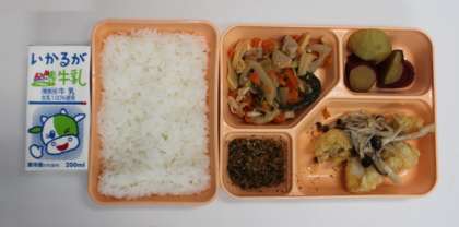 10月9日(火) 給食の献立は、白身魚のきのこあんかけ、鶏肉と野菜の炒め煮、さつまいもの甘煮、おかか菜っ葉、米飯、牛乳でした。