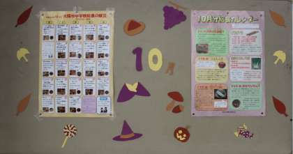 保健室前の掲示板には、1年Fさんが作成した「秋の深まりを感じるイラスト」が掲示されています。