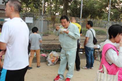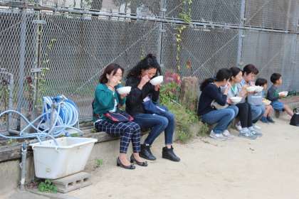 体育館でのプログラムの後は、炊き出しカレーの試食です。