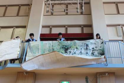 各クラス6班に分かれて、532(19×28)マスの方眼紙196枚に、1マス1マスに「赤」「黒」「緑」「青」等の色を、色えんぴつを用いて塗る作業を行いました。かなり大変な作業だったことが想像できます。ぜひ、文化発表会当日体育館で「力作」をご覧ください。