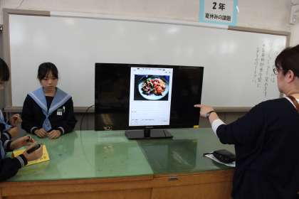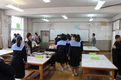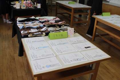 家庭科 1年生はT・O・Pに合わせたコーディネート作品を、2年生は夏休みの宿題レポートをスライドショーで、3年生は幼児のおもちゃづくりアイデアのレポートを展示しています。