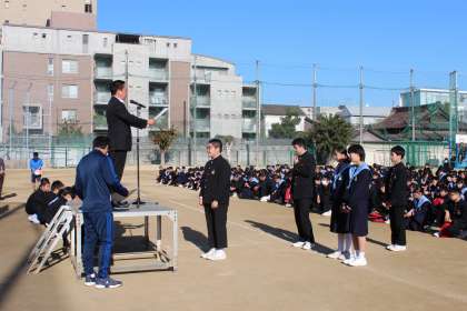 第27回大阪市中学校総合文化祭の演劇部門で代表表彰を受けた3年Hくんが、校長先生から表彰状が授与され、全校生徒から大きな拍手で祝福されました。おめでとう!