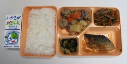 10月25日(木) 給食の献立は、鯖のおろしポン酢かけ、豚肉と一口ごぼう天の煮もの、きんぴらごぼう、小松菜とはくさいのおひたし、米飯、牛乳でした。