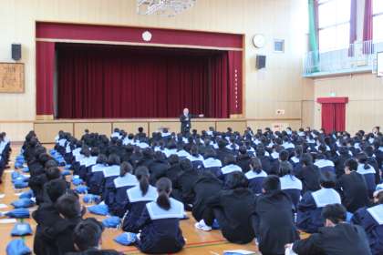 ユーモア溢れたトークで、「働くこと」「職業体験に対する心構え」を学びました。「働く」のは、「自分のため」であり、巡りめぐって「世の中の人のため」でもあるという話を、生徒たちは真剣に聞いていました。