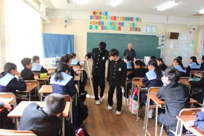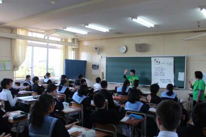 「車いす体験」、「手話」、「ロービジョン」を通じて、「障がいのある人を理解し、自分たちがすべきことを考え行動する力をつけさせること」を目的にしています。「手話」では、「阪南中学校」、中島みゆきの歌「糸」を指文字で表現することを学びました。