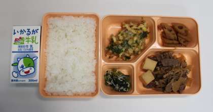 10月30日(火) 給食の献立は、すき焼き煮、かきあげ、れんこんの甘辛炒め、小松菜とじゃこのおひたし、米飯、牛乳でした。
