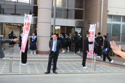 生徒会役員は幟(のぼり)をもって呼びかけています。