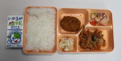 11月1日(木) 給食の献立は、豚肉のバーベキューソース炒め、コロッケ、ベーコンと野菜の洋風煮、カリフラワーのサラダ、米飯、牛乳でした。
