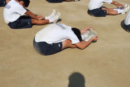 補強運動が終わり、屈伸運動などをして、いよいよ柔軟運動です。