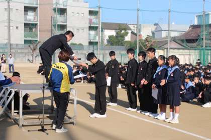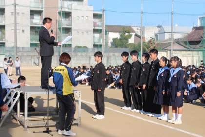 11月5日(月)朝、全校集会で陸上部の生徒たちに校長先生から表彰状が授与され、生徒全員から大きな拍手で祝福されました。おめでとうございます!