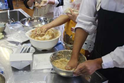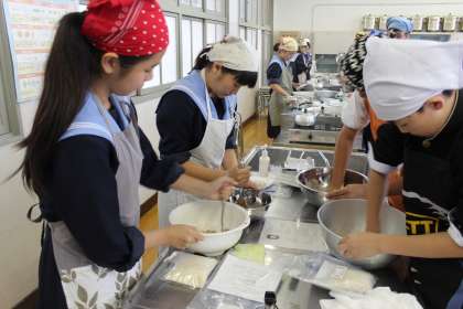 4限、2年7組の家庭科「手前みそづくり」を取材してきました。