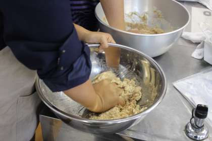 なかなかペースト状にならなくて、苦戦する生徒がたくさんいました。最後は、手で押し潰しました。
