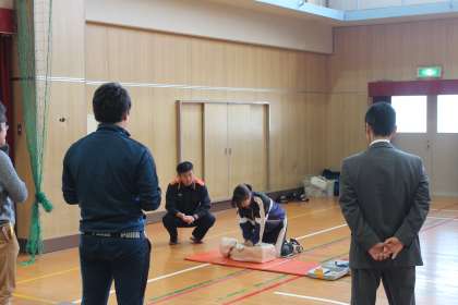 「いざ」という時のために訓練が大切です。人形モデルを使い、「一次救命処置」訓練を行いました。