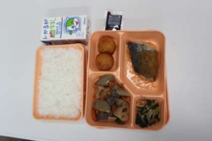 今日の給食メニューは、さごしのおろしじょうゆかけ・筑前煮・揚げたこ焼き・小松菜のおかか炒め・米飯・牛乳の6品です。