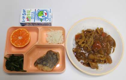 冬野菜の和風カレーライス(ほうれん草を添えて)・白身魚のから揚げ・カリフラワーの柚子の香あえ・みかん・米飯・牛乳の6品です。