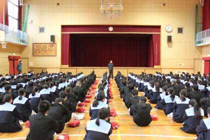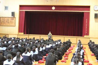 集会では、長阪先生からは、冬休み中に頭髪を違反となるような髪型にしないように、お金を持ち歩いて犯罪に巻き込まれることのないように、夜更かしをして生活のリズムを崩さないようにしようと、お話がありました。