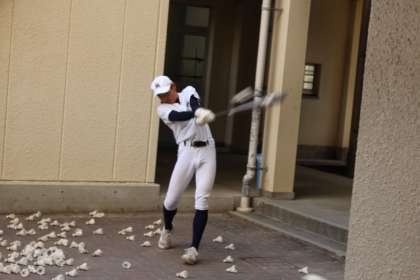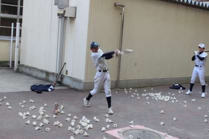 中庭でバッティングの練習です。