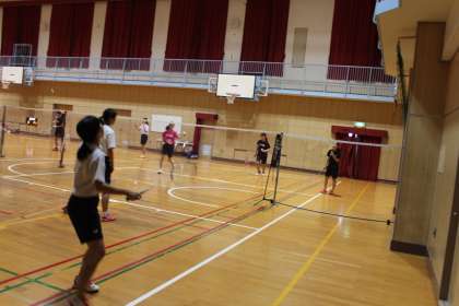 午後の体育館、バドミントン部が活動しています。