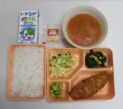 1月11日(金) 給食の献立は、ミネストローネ(枝豆)、白身魚フライ、マカロニサラダ、ほうれん草とコーンのソテー、米飯、牛乳でした。