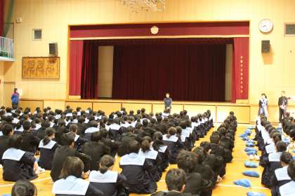 もうすぐ3年生になりますが、大丈夫ですか。気が緩んでいませんか。とても心配です。普段の生徒のみなさんは、もう少しがんばれると思います。明日は、「百人一首大会」です。マラソン大会、実力テストと続きます。しっかり、準備していきましょう。普段の学校生活を考え直してほしいと思います。みなさんならできると思いますと、お話がありました。