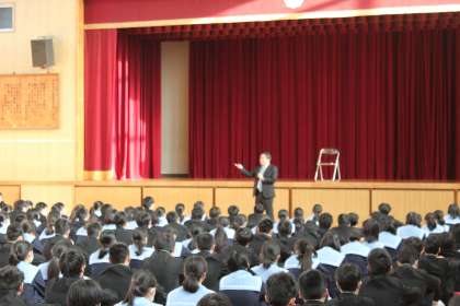 1月16日(水)朝、3年生は体育館にて、校長先生から「集団面接の受け方」について、入室のしかた、椅子の座り方、答え方等について、身振り手振りを交えながら、説明がありました。