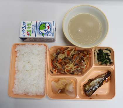 1月18日(金) 給食の献立は、かやくご飯、秋刀魚のおかか煮、風呂吹きだいこん、きくなの煮びたし、かす汁、米飯、牛乳でした。