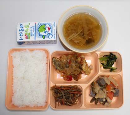 1月21日(月)、今日の給食は、白身魚の南蛮漬け・鶏肉とこんにゃくのみそ煮・きんぴらごぼう・小松菜のごまあえ・すまし汁・米飯・牛乳の7品です。