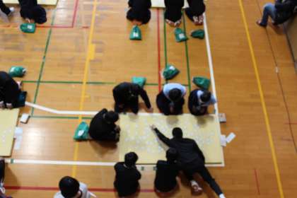 各畳に1組から7組の生徒が1人ずつ座り、100枚の札を取り合います。