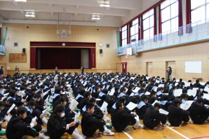 1月28日(月)6限、体育館で明日29日に実施します「1、2年生合同マラソン大会」の事前指導を行いました。