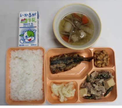 今日の給食は、鰯のかば焼き・豚肉とあつあげの煮もの・カリフラワーの柚子の香あえ・福々豆・のっぺい汁・米飯・牛乳の7品です。