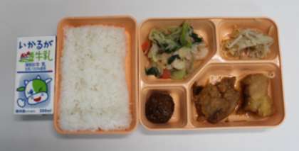 2月5日(火) 給食の献立は、油淋鶏、えびとチンゲンサイの炒めもの、もやしのナムル、肉だんご、米飯、牛乳でした。