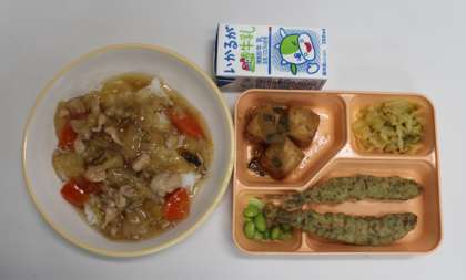 2月6日(水) 給食の献立は、鶏すき丼(枝豆)、ししゃもの磯辺揚げ、焼きあつあげ、キャベツのごまあえ、米飯、牛乳でした。