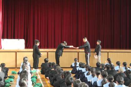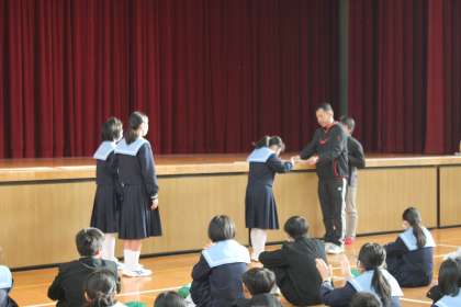 風紀点検の後は、1月25日に実施された「百人一首大会」の表彰式です。