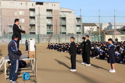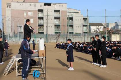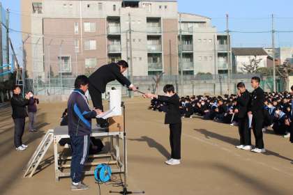 1月29日(火)長居公園周回道路で開催された「1・2年マラソン大会」2年総合の部において、優秀な成績を収めたクラスの代表生徒に校長先生から表彰状が授与され、全校生徒から大きな拍手で祝福されました。