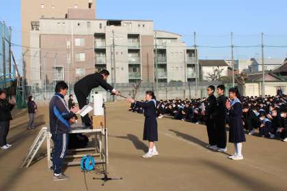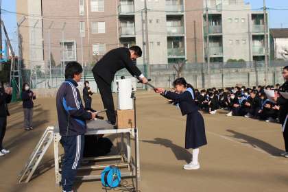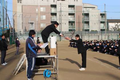 1月29日(火)長居公園周回道路で開催された「1・2年マラソン大会」1年総合の部において、優秀な成績を収めたクラスの代表生徒に校長先生から表彰状が授与され、全校生徒から大きな拍手で祝福されました。
