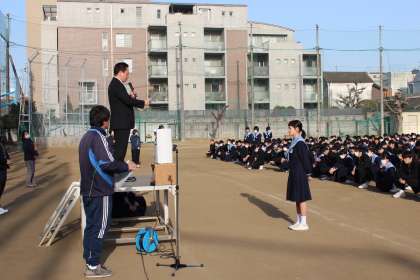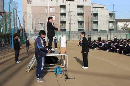 1月29日(火)長居公園周回道路で開催された「1・2年マラソン大会」で、男子の部、女子の部の上位10位までの生徒が発表され、代表して優勝した男子、女子生徒が校長先生から表彰状が授与され、全校生徒から大きな拍手で祝福されました。