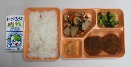 2月12日(火) 給食の献立は、みそかつ、鶏肉と野菜の煮もの、ブロッコリーのごまあえ、かぶの煮もの、米飯、牛乳でした。