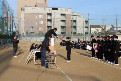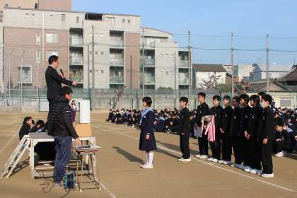 「大阪市民駅伝競走大会」で入賞した陸上部の生徒たちに、校長先生から表彰状が授与され、生徒全員から大きな拍手で祝福されました。おめでとうございます!