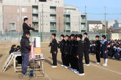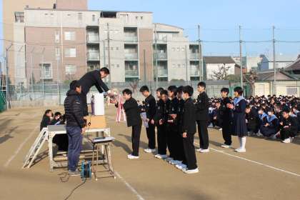 2月18日(月)朝、「大阪中学生選抜卓球大会」で見事優勝した卓球部の生徒たちに、校長先生から表彰状並びに優勝カップが授与され、生徒全員から大きな拍手で祝福されました。おめでとうございます!