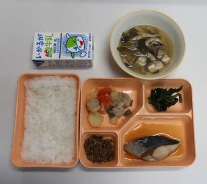 2月18日(月) 給食の献立は、鰤の甘辛だれかけ、鶏肉とじゃがいもの煮もの、ほうれん草のおひたし、おかか菜っ葉、けんちん汁、米飯、牛乳でした。
