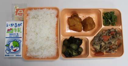 今日の給食は、チキン南蛮・干しずいきの炒め煮・きゅうりとわかめの酢のもの・じゃこピーマン・米飯・牛乳の6品です。