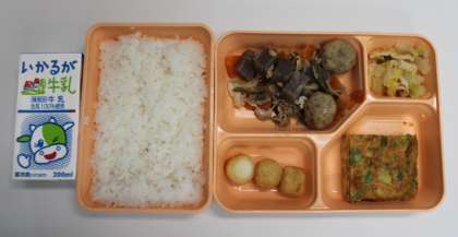 今日の給食メニューは、豚肉と一口ごぼう天の煮もの・揚げポテトもち・はくさいの煮びたし・米飯・牛乳の6品です。