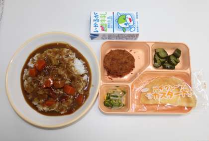 3月6日(金) 給食の献立は、ポークカレーライス、ミンチカツ、きゅうりのピクルス、野菜ソテー、プチクレープ、米飯、牛乳でした。