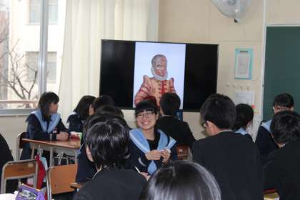 3年2組は社会、若江先生による歴史上の人物写真クイズ大会です。