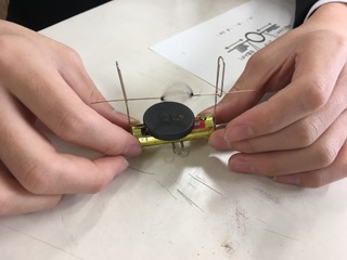モーターの仕組みを確認した後は、いよいよクリップモーターの作成です。まず、1人1本ずつ30cmのエナメル線を渡されますので、コイルを作ります。次に、乾電池にクリップを折り曲げて作った軸受けをセロハンテープで取り付けて、磁石をのせます。最後に先ほど作ったコイルを軸受けに乗せると、面白いように回ってくれます。